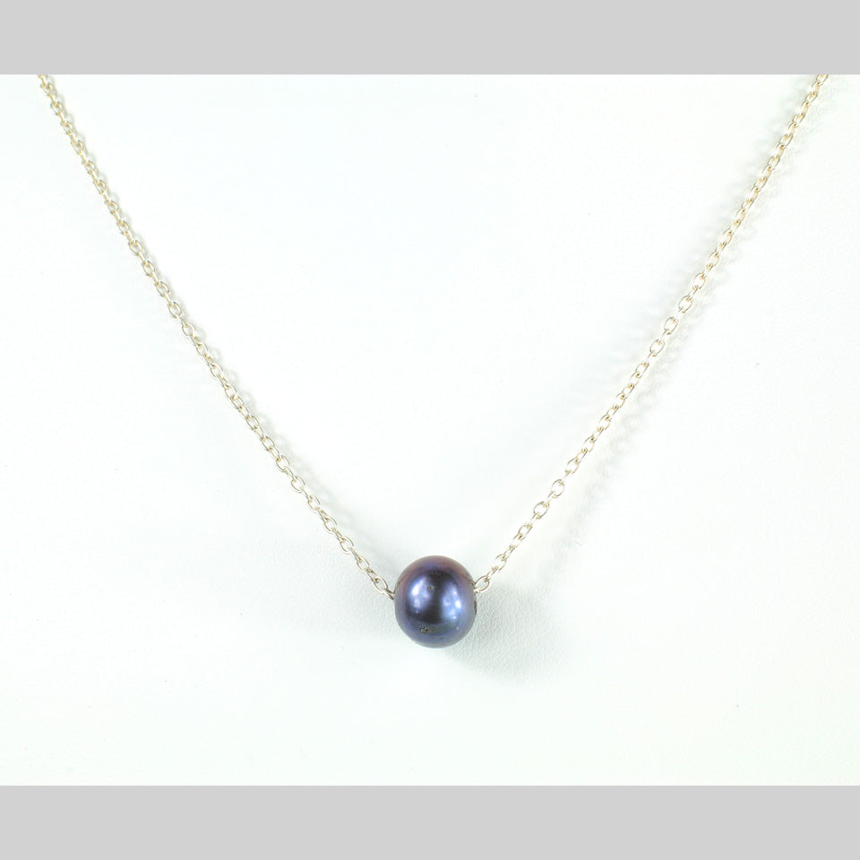 This Necklace makes a simple and elegant statement. This gorgeous lustery freshwater pearl floats gently on a light weight sterling silver chain. It is finished with two tiny faceted pieces of Iolite, and a small spring clasp.