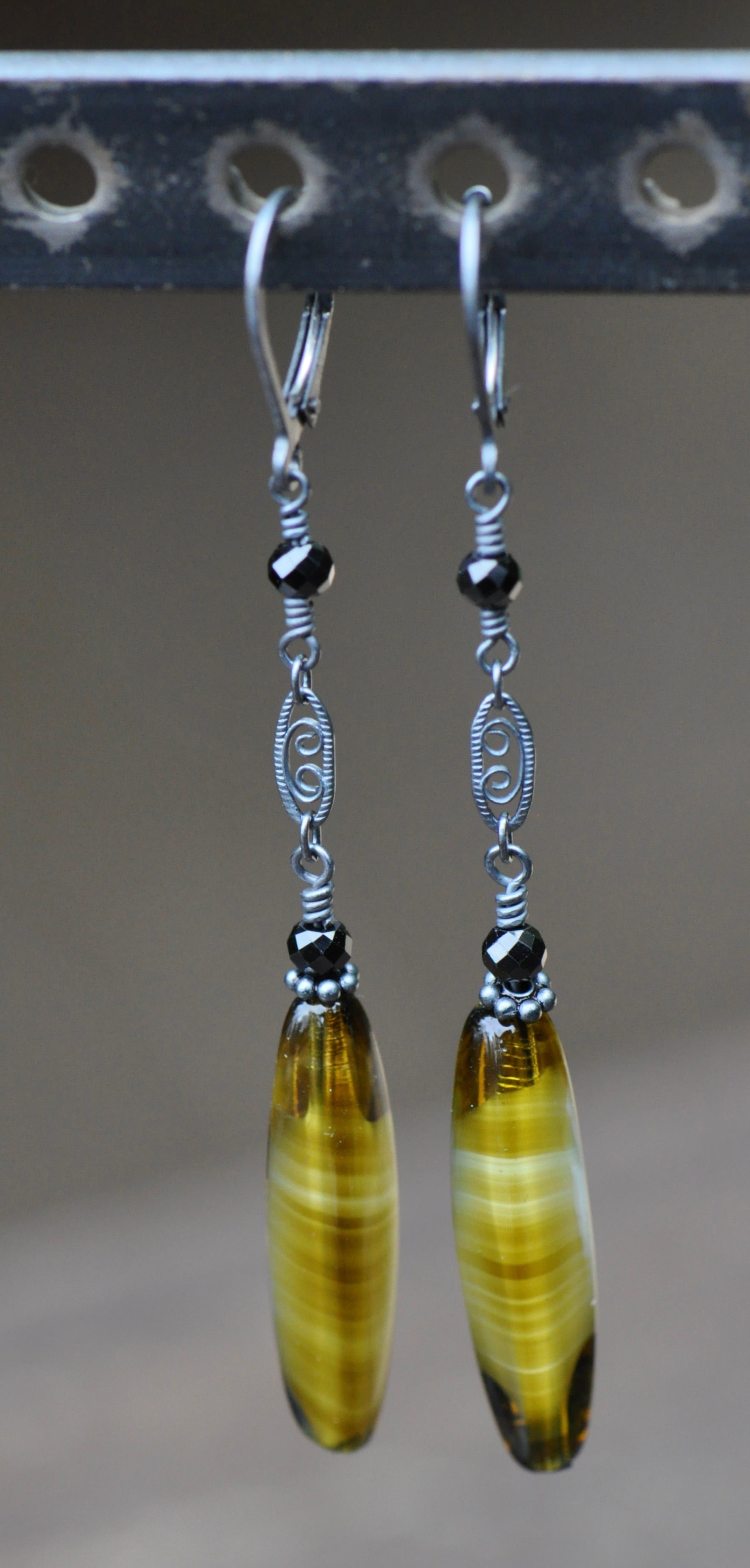 These beauties are made with German glass beads from the 1950's. They are combined with black onyx, Indonesian spacer bead, and Italian filagree chain link. They are wire wrapped on oxidized sterling silver, and have lever back ear wires. Length is 2"